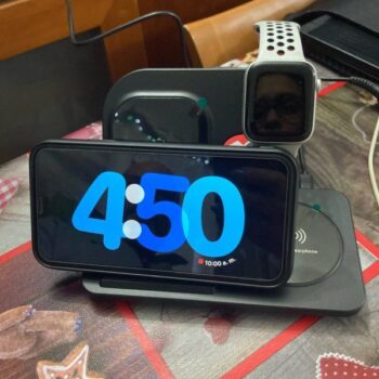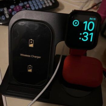 This charger performs well, especially with the phone in a horizontal position for nightstand use. My advice would be to redesign the Apple Watch charging area for better stability. Despite the base not being weighted, the unit remains balanced