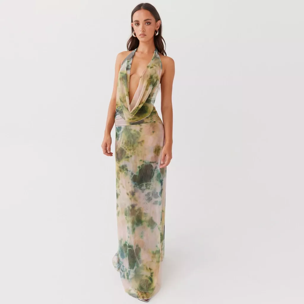 What sets this dress apart is its blend of classic elegance and modern design. The backless and halter-neck silhouette paired with a deep V-neck and lace-up back offer a timeless yet contemporary look. The natural waistline and slim-fit design enhance your figure, ensuring you look and feel your best.
