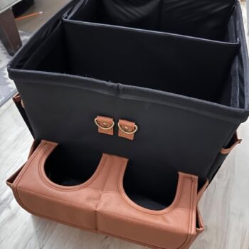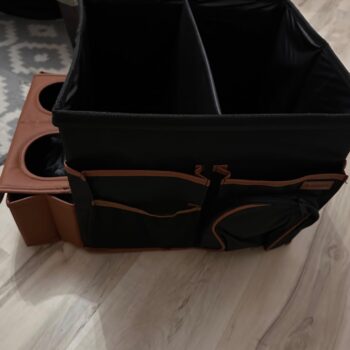 Large compartment with a removable divider, eight side pockets and two front pockets can hold everything you need on the road – from drinks to gadgets. It is suitable for all car models, and you can use it in your front seat, back seat, or even in the trunk. Plus, the lid works as a backseat table!