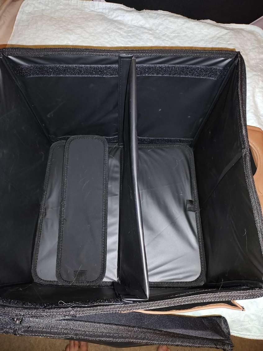 I wish I had found this earlier! Nowadays, I often forget to bring my shopping bag, but this is amazing! It's perfect for when I'm going to the store for a few things and don't want them flying around in the trunk. The dividers are really useful too. However, even though I bought the large size, I think I'll get the extra-large size because it's a bit too small for my car. I drive a 2021 Chevy Blazer, and I feel like the extra-large size would be just right. I highly recommend this thing though!